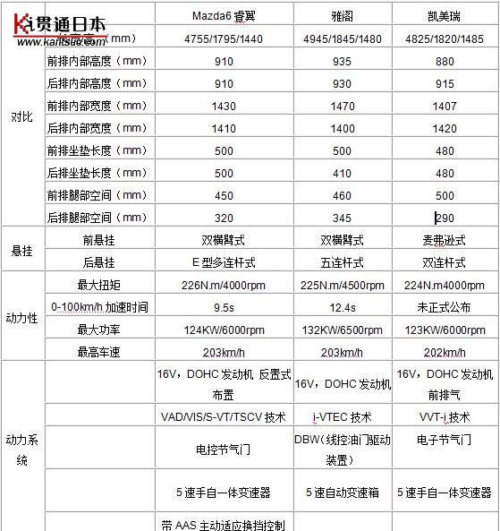 Mazda6睿翼:快感至上 如果问谁让我一下子就记住了他的外形,那一定是Mazda6睿翼。外观其实是一个挺主观的东西,但力与美大家都能感受到。Mazda6睿翼隆起的前翼子板,给人的感觉Mazda6睿翼应该是乔丹式的,浑身都是长条肌,基本不含脂肪,极具爆发力——这点从1458千克的最小整备质量上也能得到体现。进入他的内室,还有惊喜等着你:只有Mazda6睿翼在方向盘上集成了换挡拨片;仪表盘上红色为主,蓝色为辅的背光,就像是斗牛士的斗篷刺激着你的视觉神经。在Mazda6睿翼车里,没有激情成不了气候。 看着行, 实际行不行还得测试说了算。Mazda6睿翼在我们的测试中,也可以用异军突起、鹤立鸡群来形容。2488毫升的肺活量,虽然最大功率169马力是三车中居中的,但最大扭矩还是比雅阁略高,而且出现最大功率和最大扭矩的转速都是最低的——显然Mazda6睿翼具有低转速高爆发力的特点。在中低速时,他始终保持了对雅阁和凯美瑞的优势,相信在城市中超车他是一把好手。另外,Mazda6睿翼也是惟一一辆在测试中达到200公里/小时的车辆。