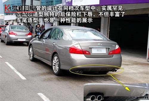 如果说M35在车头还有所保留的话,在车尾的处理上,M35则完全展示出其动感的面。4根排气管的设计和充满空气动力学原理的后保险杠。不但在视觉上给它加满了分,而且也是一种性能的展示。 |